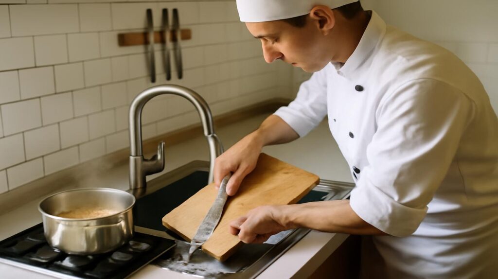 | Washing knives immediately after use | “I want my tools ready and safe.” | Attention to detail, safety awareness |